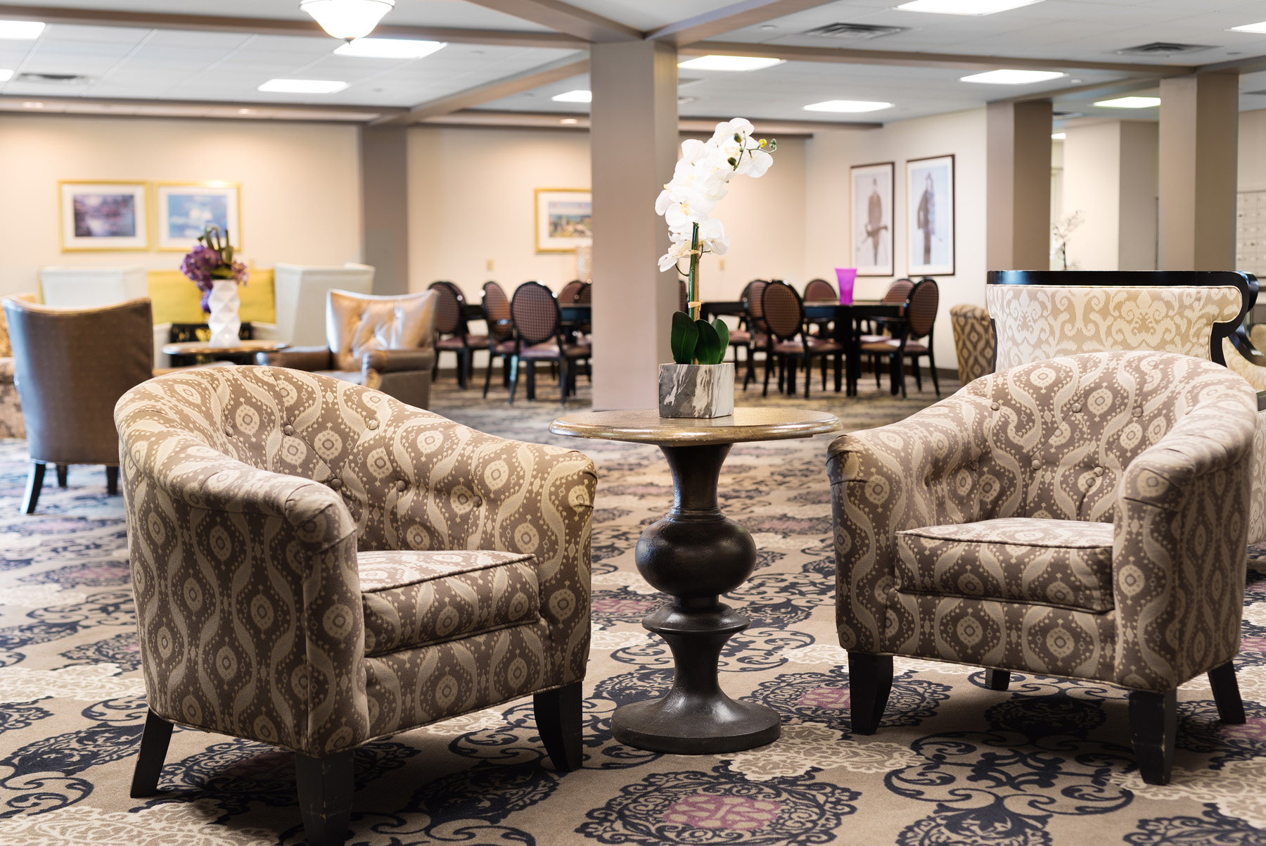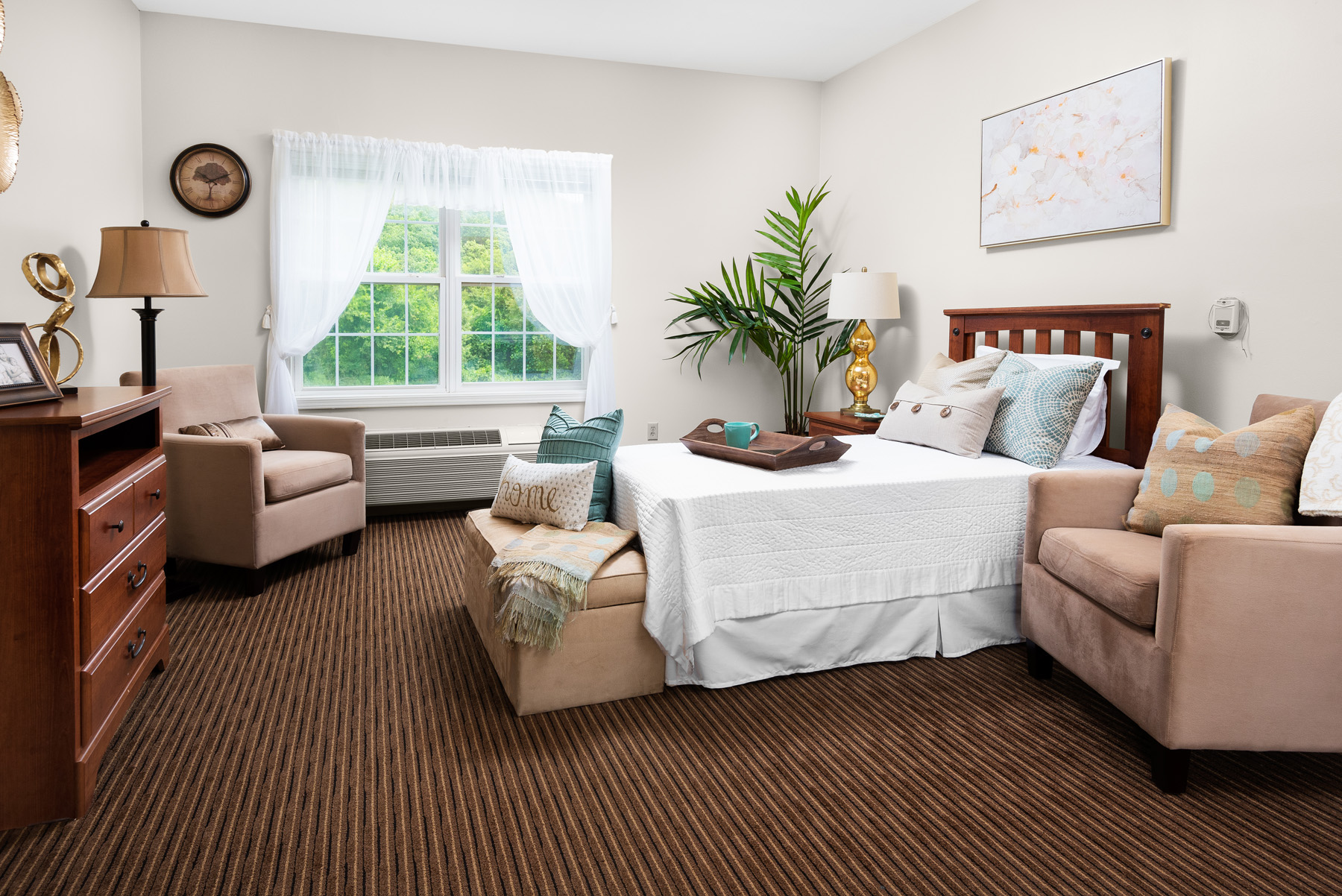 Residents can choose between cozy studio apartments or companion suites, each featuring a kitchenette with a mini-fridge and a pull-cord alert system for peace of mind. Whether relaxing in the comfort of their own apartment or joining friends in one of the many common areas, residents feel right at home in this welcoming environment.